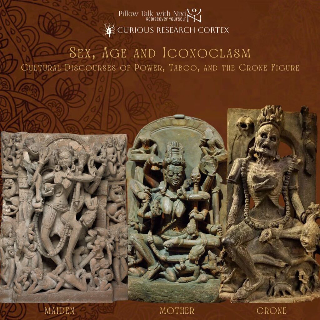 This session investigates the censorship and discomfort surrounding aging goddesses. Through comparative visual analysis, it examines how patriarchal religious frameworks suppress divine femme figures who defy reproductive utility. Their seductive gaze, erotic bodies, and transgressive presence challenge patriarchally sanitized devotional norms. By tracing visual erasure, it argues that the aging erotic goddess is marginalized not for obscenity, but for embodying sovereign, post-reproductive power, thus disrupting sacred aesthetics shaped by gendered taboos and discomfort with feminine autonomy beyond motherhood. This visual censorship enforces a sociopolitical narrative that maidens embody virginal femininity, mothers serve reproductive functions, and crones, having surpassed reproductive age, are expelled from societal and political relevance and stripped of any sexual desirability.